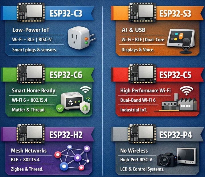 | Feature / Variant | ESP32 (Original) | ESP32-C3 | ESP32-S3 | ESP32-C6 | ESP32-C5 | ESP32-H2 | ESP32-P4 |