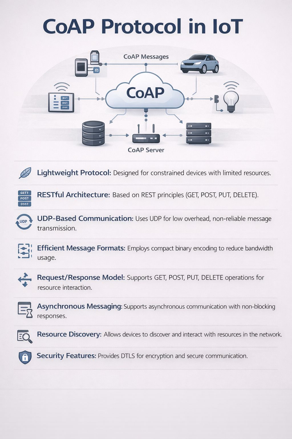 By combining a RESTful paradigm with UDP’s efficiency and highly optimized message formats, CoAP lays a robust foundation for scalable and reliable communication in the most challenging IoT environments.
