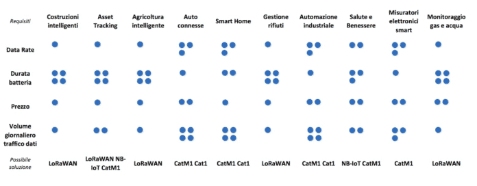 आईओटी के लिए वायरलेस तकनीकों का गहराई से ज्ञान आपको एप्लिकेशन और संदर्भ के आधार पर एक वायरलेस नेटवर्क तकनीक को दूसरे पर पसंद करता है। आम तौर पर, अधिकांश आईओटी ऑब्जेक्ट्स के लिए जिन्हें कम लागत, कम ऊर्जा और कम डेटा वॉल्यूम की आवश्यकता होती है, आप लोरावान पर भरोसा कर सकते हैं। “महत्वपूर्ण” आईओटी वस्तुओं के लिए, ज्यादातर औद्योगिक और मोटर वाहन क्षेत्रों से संबंधित, कैट 1/कैट एम 1 या एनबी-आईओटी एलटीई नेटवर्क को पसंद करना अच्छा है। विभिन्न विकल्पों के बीच मूल्यांकन किए जाने वाले पहलुओं को डेटा, बैटरी जीवन, मूल्य और दैनिक डेटा यातायात मात्रा की प्रकृति है।