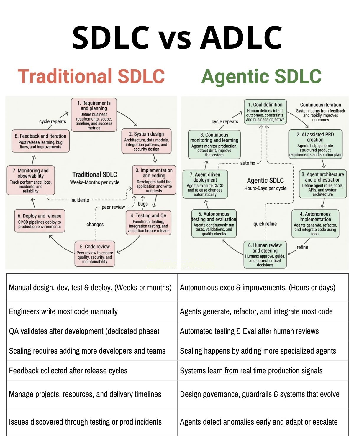 This comparative table highlights the fundamental shift in responsibilities and processes. The ADLC moves software development from a human-centric, reactive endeavor to an agent-driven, proactive, and continuously evolving system.