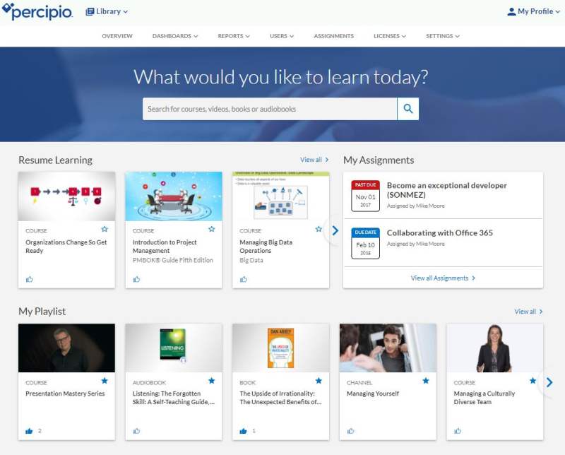 Percipio integrates with learning management systems, portals, and analytics systems to provide the right learning experience. Its APIs deliver user metrics and activity to systems of record. You can also use Percipio to personalise the learning experience by creating playlists or keeping track of existing assignments.