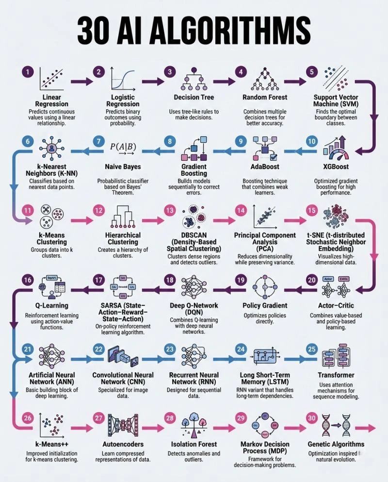 In the rapidly evolving landscape of artificial intelligence, understanding the foundational algorithms is paramount. While tools change and frameworks evolve, the core algorithms remain the enduring pillars upon which all AI innovation is built. This comprehensive guide delves into 30 essential AI algorithms, offering a structured map to navigate the diverse world of machine learning, from supervised and unsupervised learning to reinforcement learning, deep learning architectures, and optimization techniques. Mastering these algorithms means grasping 90% of the applied AI foundations that power everything from predictive analytics to autonomous systems.